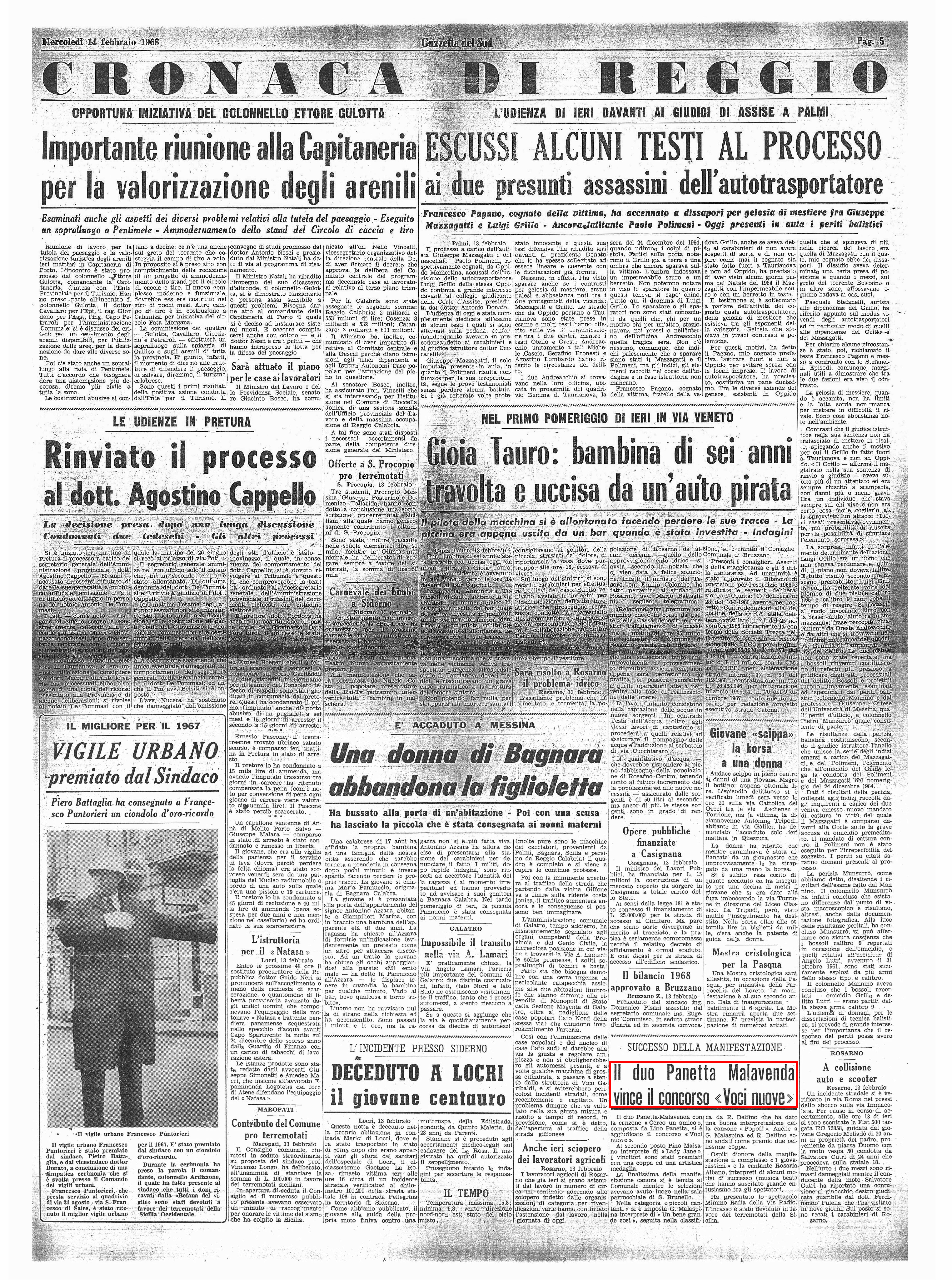 Aa. Vv., Il duo Panetta Malavenda vince il concorso “Voci nuove”, Gazzetta del Sud 14 febbraio 1968, Società Editrice Siciliana, 1968.