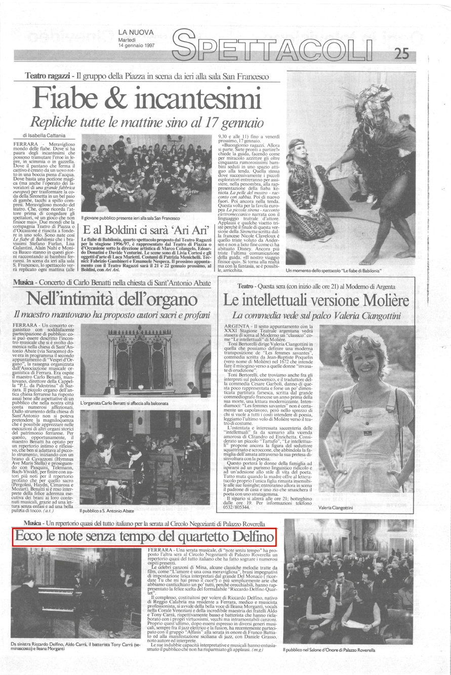 Aa. Vv., Ecco le note senza tempo del quartetto Delfino, La Nuova Ferrara 14 gennaio 1997, FINEGIL, 1997.