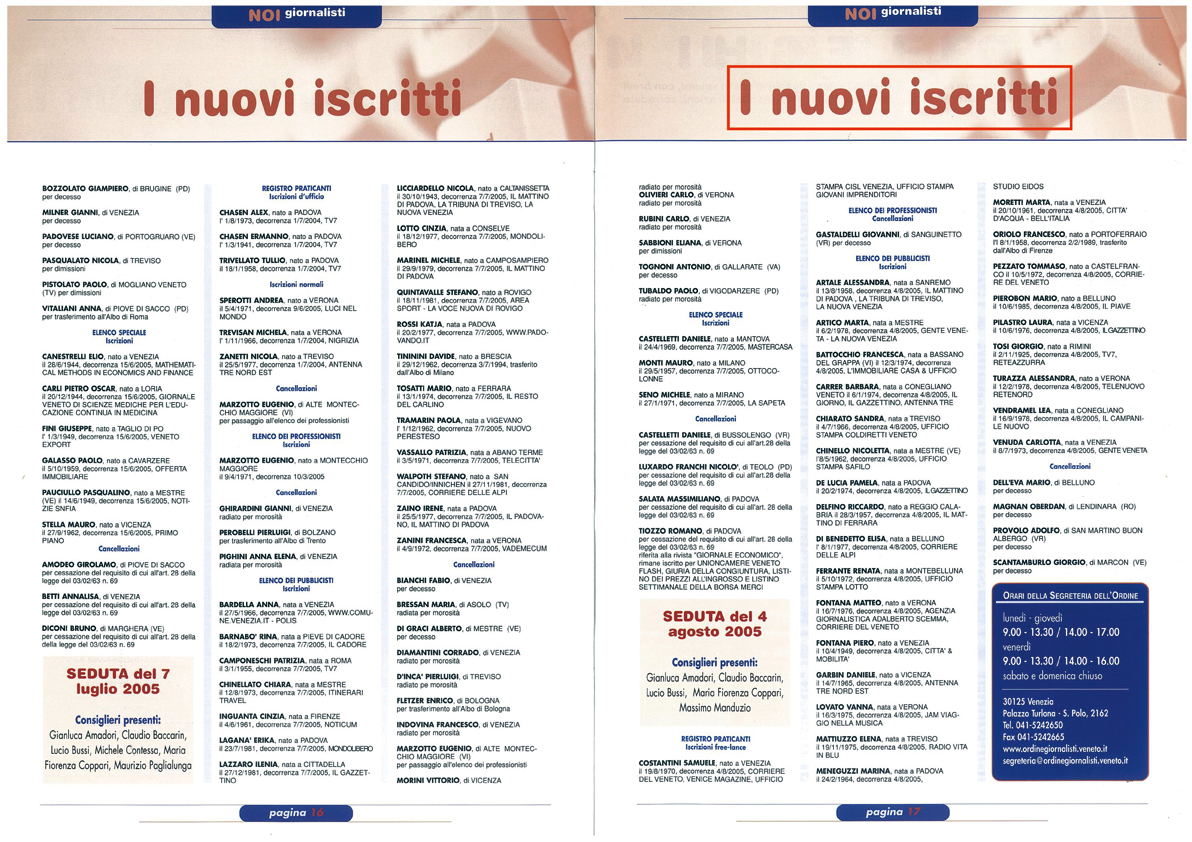 Aa. Vv., Elenco dei Pubblicisti. Iscrizioni, Noi giornalisti 3/2005, Ordine dei Giornalisti del Veneto, 2005.
