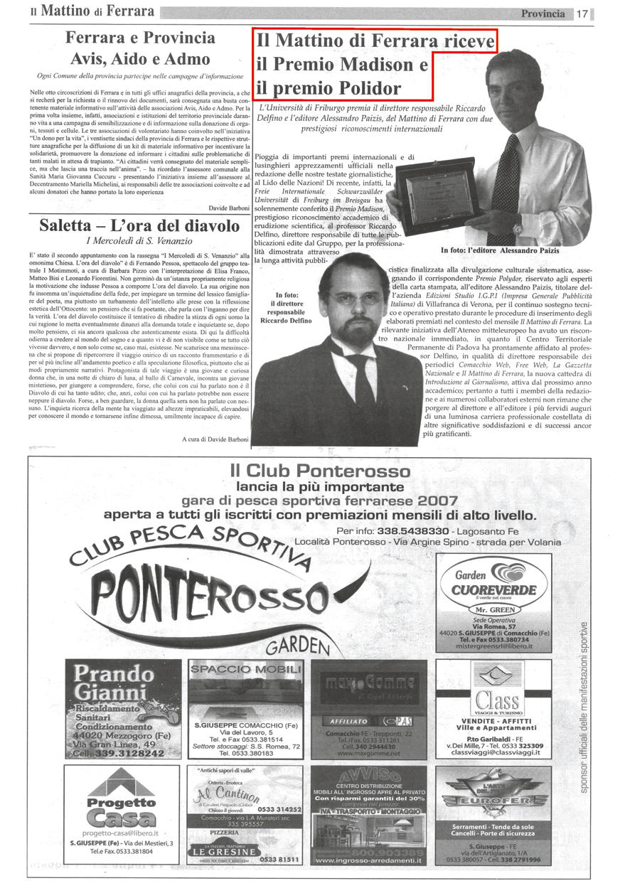 Riccardo Delfino, Il Mattino di Ferrara riceve il Premio Madison e il Premio Polydor, Il Mattino di Ferrara 7 e 8/2007, Studio IGPI, 2007.