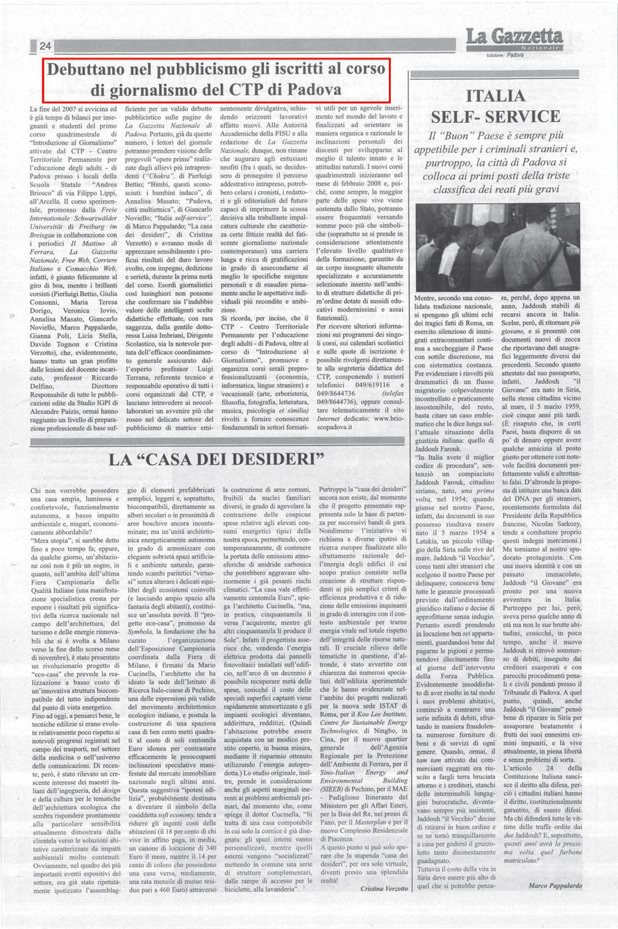 Riccardo Delfino, È iniziato il nuovo Corso di Giornalismo al CTP di Padova, La Gazzetta Nazionale (Edizione di Padova) 3 e 4/2008, Studio IGPI, 2008.